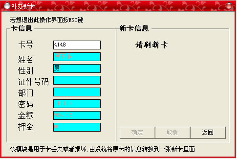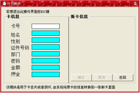 此菜單的功能主要是:如果客戶的卡掛失后確認(rèn)找不到以后,就要給其補(bǔ)辦一張新卡,并將原卡中的金額轉(zhuǎn)入到新卡當(dāng)中。