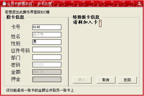 此菜單的主要功能是:將一張卡的金額合并到另外一張卡上,在進(jìn)行并卡處理之前一定要先將要并卡處理的卡進(jìn)行掛失操作,然后在出現(xiàn)的窗口中輸入要合并的卡號(hào)回車,提示輸入轉(zhuǎn)到的卡號(hào)然后回車,會(huì)出現(xiàn)如下的提示,點(diǎn)“確定”按鈕則合并成功,點(diǎn)“取消”按鈕,則取消本次操作,操作完畢點(diǎn)“返回”退出。