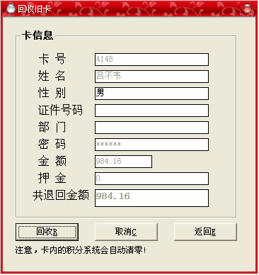 出現(xiàn)如上窗口后,輸入要收回的卡號(hào),直接回車,會(huì)顯示所有資料,然后點(diǎn)“回收”按鈕,出現(xiàn)一提示提示是否要回收,點(diǎn)“確定”按鈕回收成功,操作完畢后點(diǎn)“返回”按鈕退出。