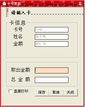 此菜單的功能主要是:減少卡中的金額,與“卡中存款”功能相反,在如下窗口,操作同〔卡中存款〕。
