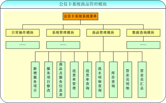 會(huì)員卡系統(tǒng)中的商品管理模塊主要是對(duì)系統(tǒng)中商品的各項(xiàng)操作,分為新增服務(wù)項(xiàng)目、服務(wù)項(xiàng)目修改、商品及服務(wù)信息表、進(jìn)貨單管理、進(jìn)貨單查詢等多個(gè)部分,是會(huì)員卡管理系統(tǒng)中一個(gè)重要的組成部分。